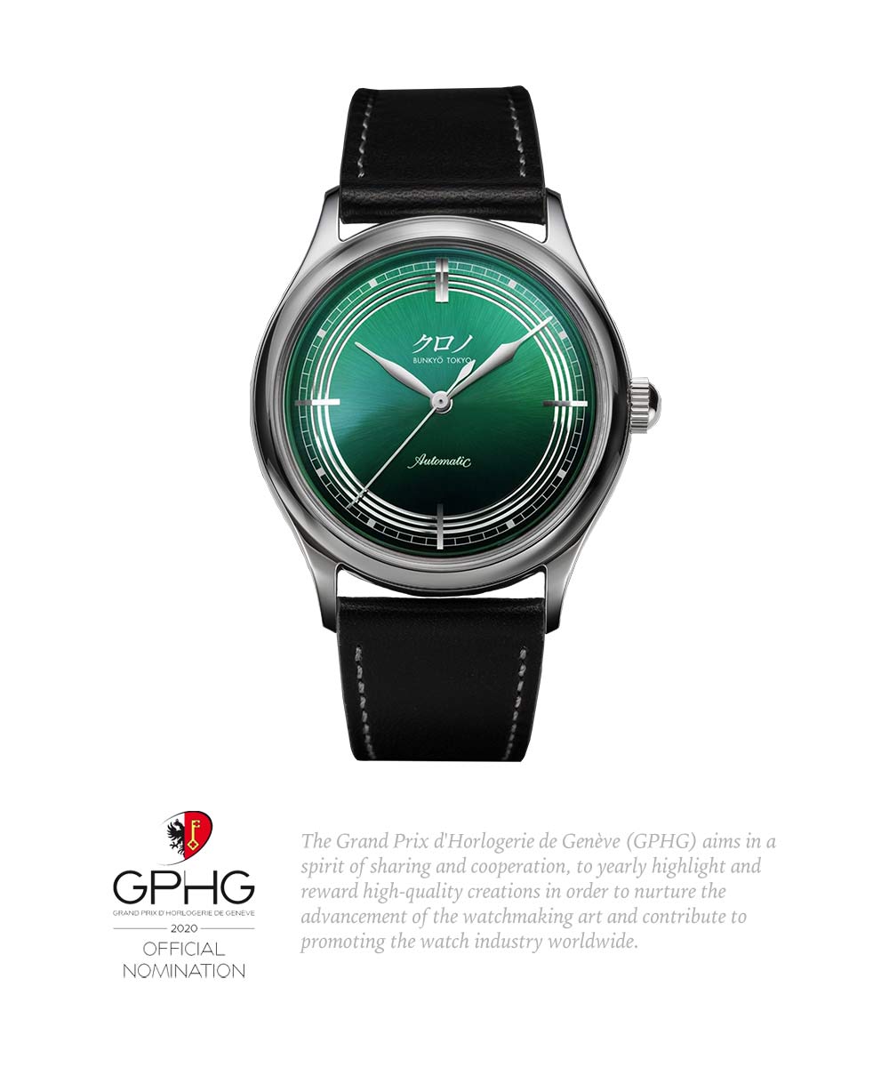 In celebration of Kurono's first anniversary in June 2020, emerges our first time-only watch - The Kurono Anniversary Green ‘森:Mori’. Featuring a scintillating metallic green with a subtle radial sunburst pattern, specially hand picked by Hajime Asaoka, the dial displays vibrant shades of viridian and emerald, to pine and forest green. The Kurono Anniversary Green 森:Mori was nominated for GPHG 2020 in the “Challenge” category.