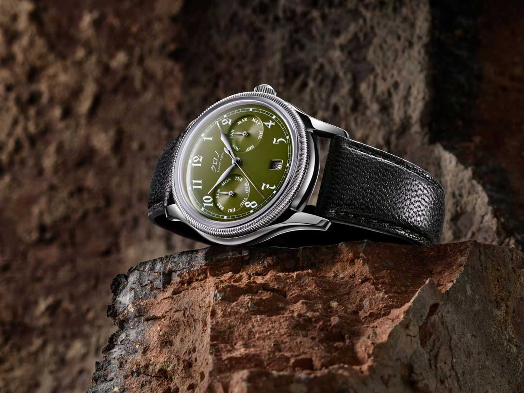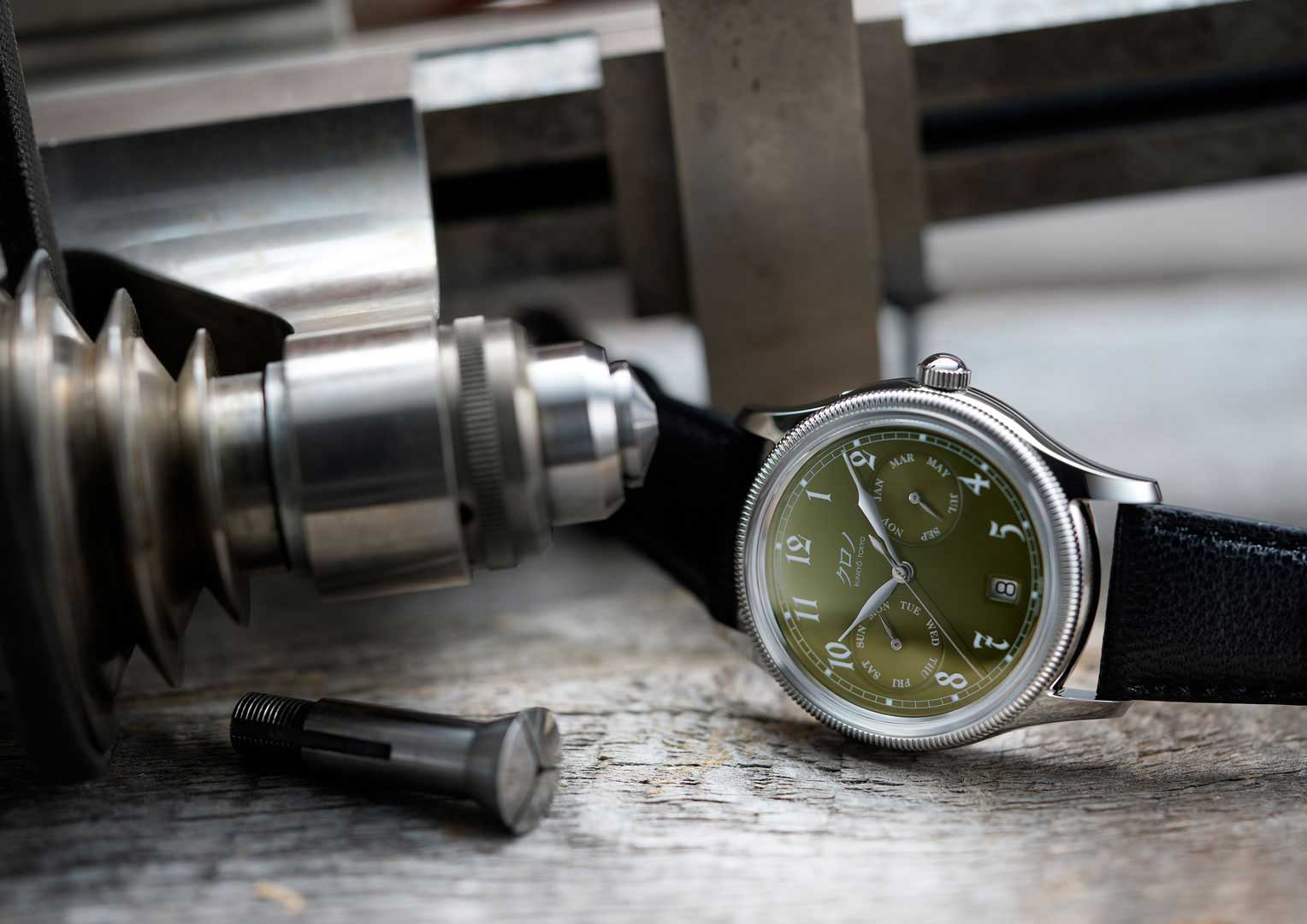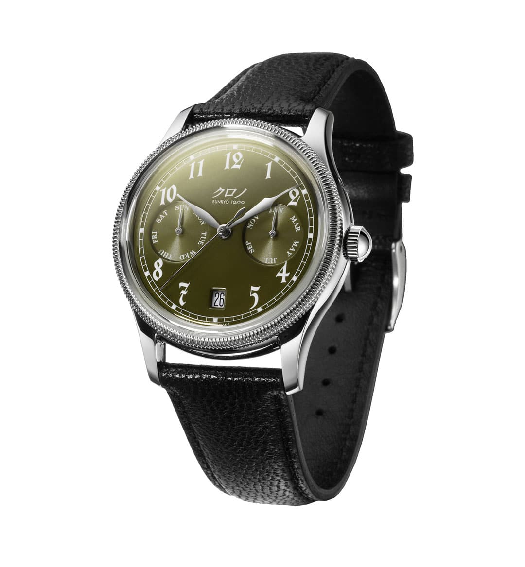The design of the Calendrier 'Type I' has been calculated to enhance the three-dimensionality of the iconic Kurono hands and the symmetry of the dial. It aims to evoke a sense of refined adventure - with its new high-polish coin edge bezel and khaki dial interplaying with an audacious blacklettered vintage typeface to evoke a bold regimental atmosphere for the wrist. Guilloche sub-dials with high-polish hands hint at the mechanical complexity of its triple calendar complication, with the mood accentuated by railway-track minute markers at the periphery.