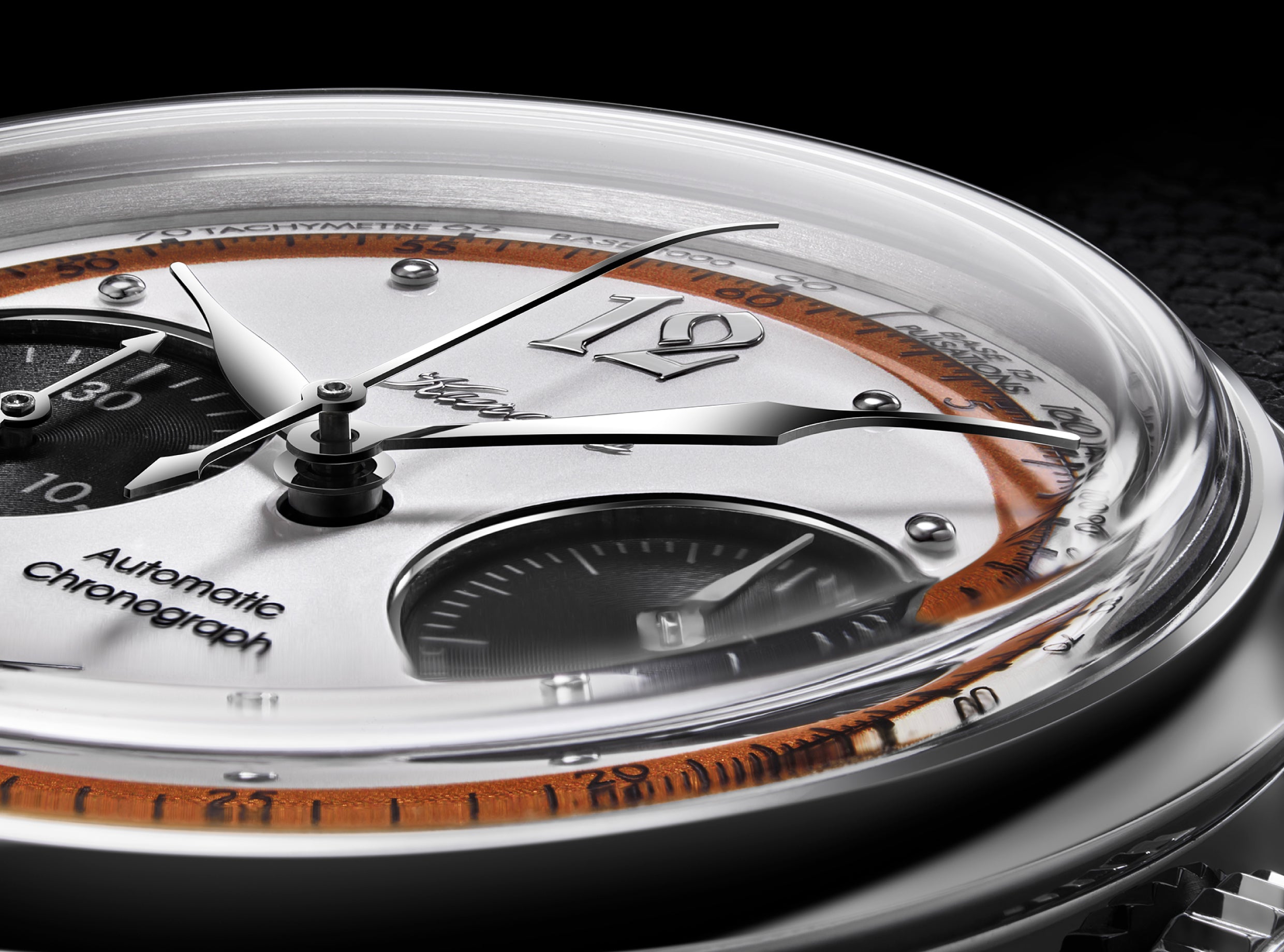 "The conventional date window is also a design element, so removing it means creating a completely new dial design. The numbers 12 and 6 are the same as those used in the Calendrier indexes. To be honest, this chronograph was designed before the Calendrier, but the Calendrier was released first because it took longer to modify the chronograph to a single-stage pull." ~ Hajime Asaoka