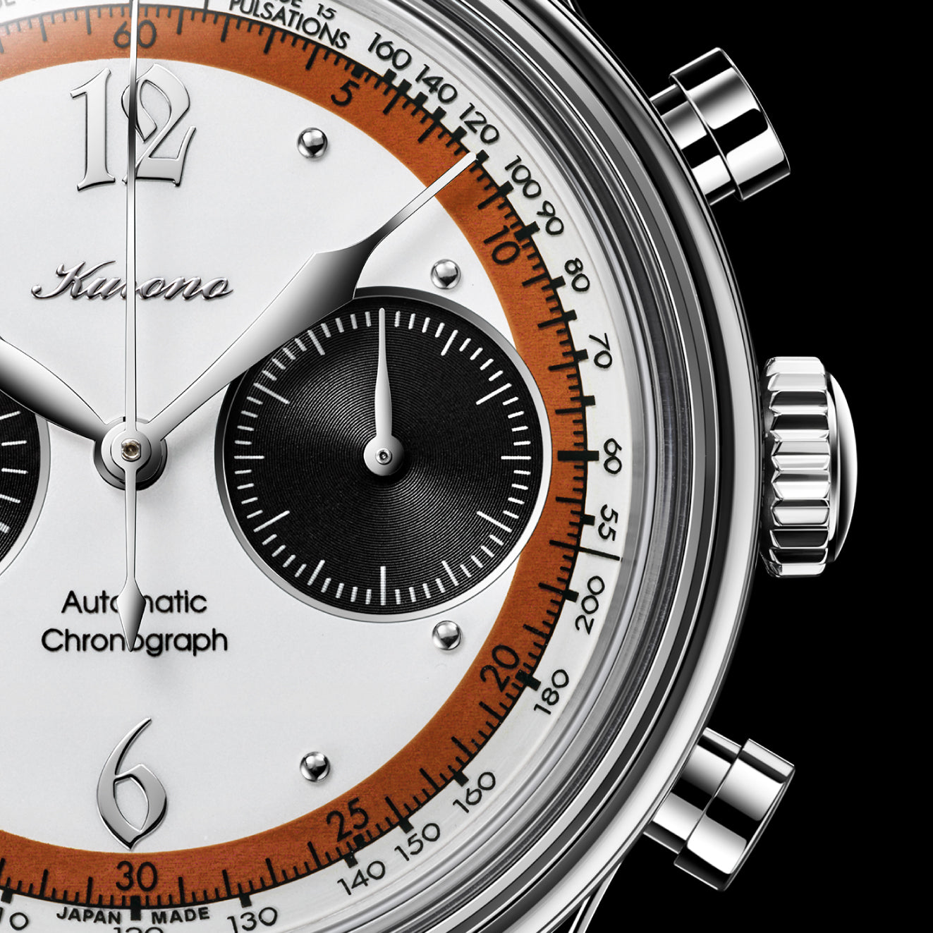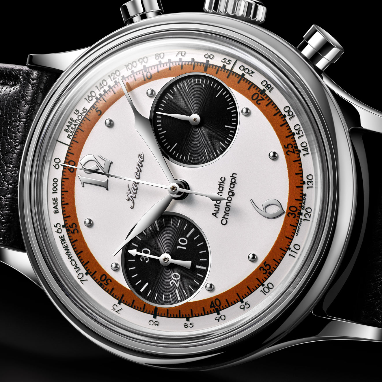 The combination of high-polish leaf hands, and modern hour and minute hands is iconic to Kurono. The tips of the minute and chronograph seconds hands are bent by hand to match the curves of the dial and glass. The guilloche subdial at '9' is set with a unique subhand in the shape of a traditional Japanese 'kyudo' arrow.
