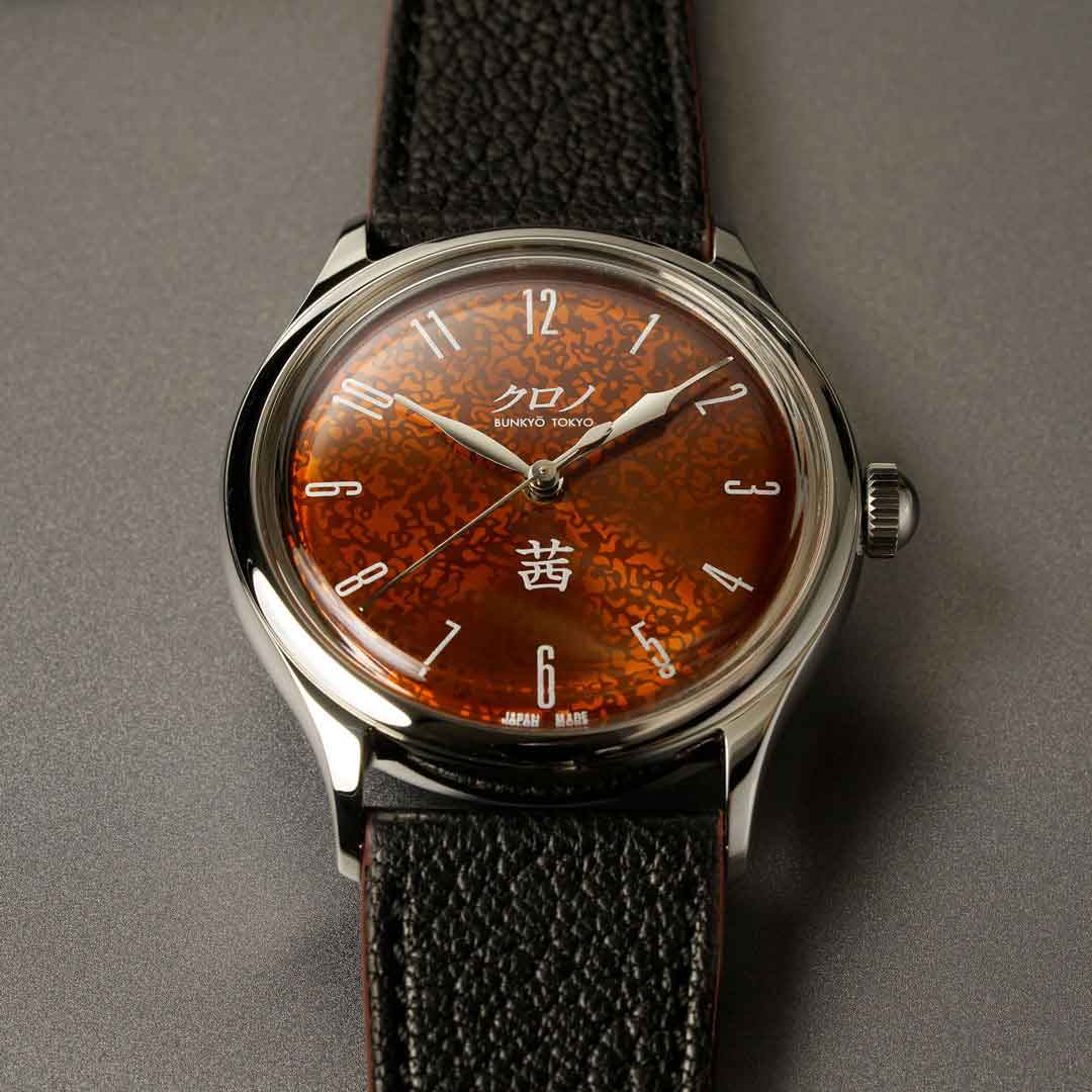 Kurono’s first artisan-level timepiece, the Grand:Akane ‘茜’ in November 2020, features a uniquely made urushi dial by a master craftsman, showcasing contrasting red hues that develop different color shades over time according to the usage of the owner. The dial features a ‘Hamon (刃文)’ design that is finished with the traditional Japanese ‘Niiro 煮色’ chemical treatment and further sealed by an additional layer of suki-urushi (transparent lacquer). The design is finished with arabic numerals in silver, and the character "茜" at the 6 o'clock position alludes to the color of the dial based on the image of a daruma sunset. The Grand:Akane features a special, never seen before caseback that is significant only to the 'Grand' line of watches - Hajime Asaoka's calligraphic signature, flanked by his hanko impression and the Kurono logo.