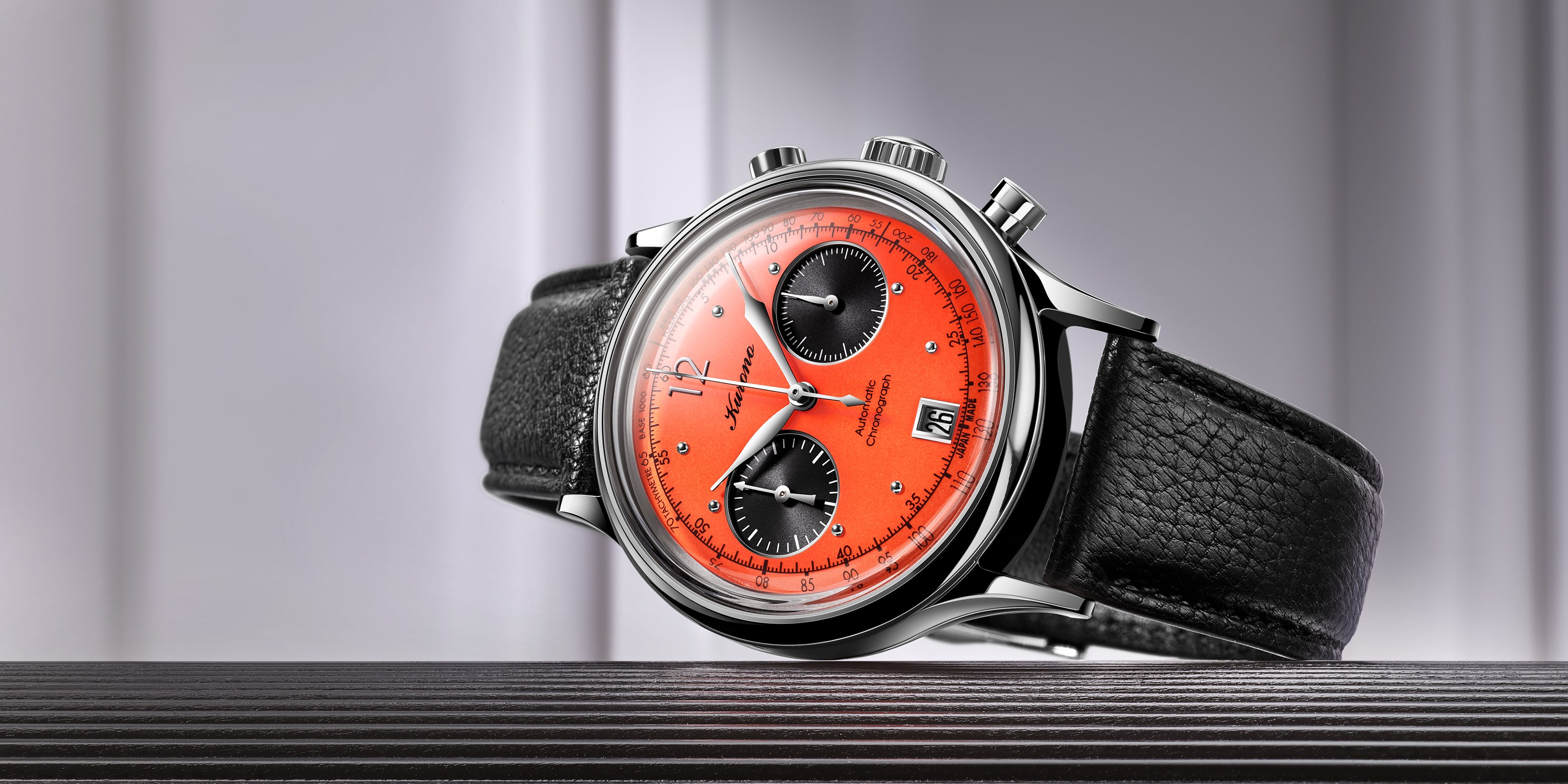 On the wrist, the Vermilion Chronograph is a bold statement highly recognizable from near or afar, and at 38mm is based on the slim Mk.2 chronograph case.